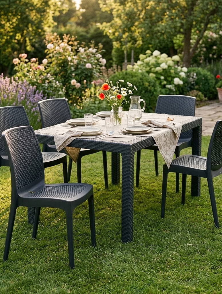 Τα τραπέζια και οι καρέκλες με σχέδιο rattan της TERRAZZA Collection της MADI αποτελούν μια πρακτική και κομψή λύση για κάθε εξωτερικό χώρο. Ο σχεδιασμός τους προσφέρει την αισθητική της φυσικής πλέξης rattan, ενώ η κατασκευή από ανθεκτικό πλαστικό εξασφαλίζει μεγάλη αντοχή στη χρήση και στις καιρικές συνθήκες.